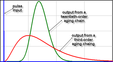 ورودی پالس به زنجیره پیری منجر ی به خروجی توزیع قوسی میشود. برای یک زنجیره پیری که ثابتهای زمانی هر مرحله با هم برابر هستند، هر چه سطوح بیشتری در زنجیره باشد، جریان خروجی حول تأخیر کل زنجیره متمرکز میشود و ناحیه مرکزی به پیک میرسد. خروجی تاخیر از یک زنجیره با مرتبه بی نهایت مساوی با ورودی است، اما با کل زمان تاخیر جبران میشود.