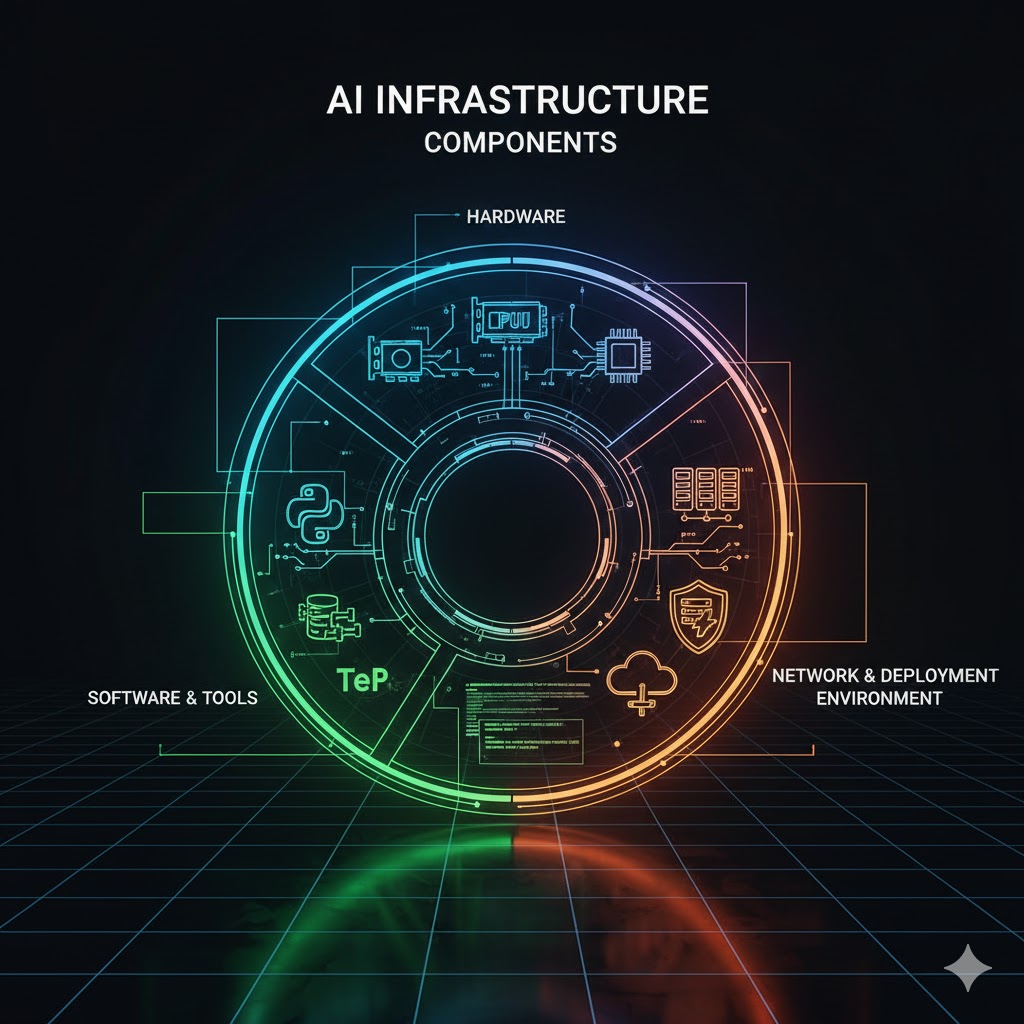 این زیرساخت نهتنها شامل سختافزارهای پرقدرت مانند GPU و TPU است، بلکه مجموعهای از دادههای گسترده، نرمافزارهای تخصصی، شبکههای پرسرعت، ابزارهای MLOps و محیطهای استقرار مقیاسپذیر را نیز شامل میشود. هر یک از این بخشها نقشی کلیدی در عملکرد، دقت و سرعت مدلهای هوش مصنوعی دارند.