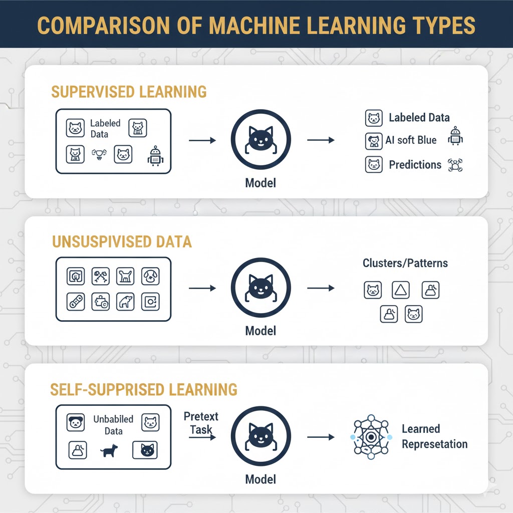 مقایسه یادگیری خود-نظارتی، نظارتشده و بدون نظارت
