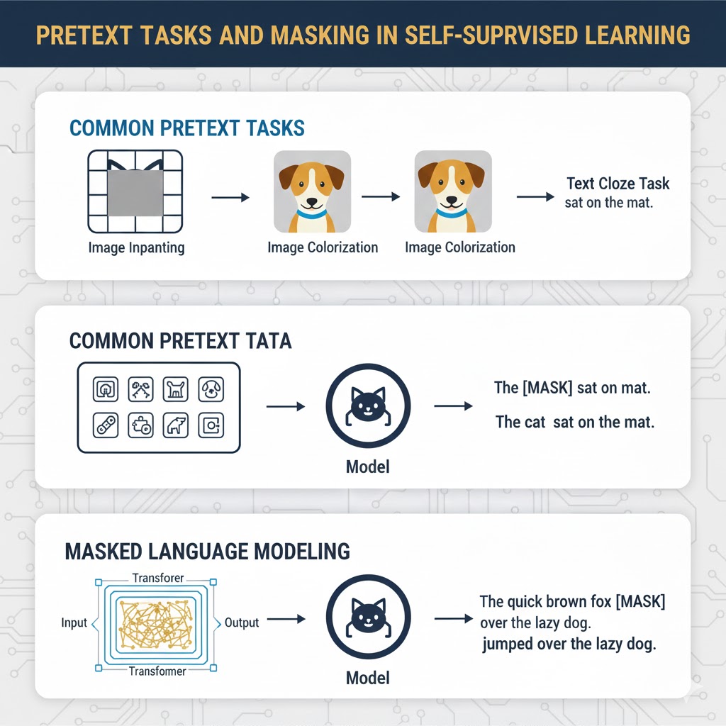 در این روش، مدلها با انجام وظایف ساختگی یا Pretext Tasks آموزش میبینند. این وظایف برچسبهای کاذب (Pseudo-labels) را از دلِ دادههای خام بیرون میکشند.
