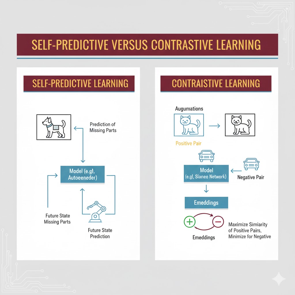 اگرچه دنیای SSL بسیار متنوع است، اما اکثر مدلها از یکی (یا هر دو) تکنیک اصلی زیر استفاده میکنند: یادگیری خود-پیشگو (Self-predictive) و یادگیری تقابلی (Contrastive).