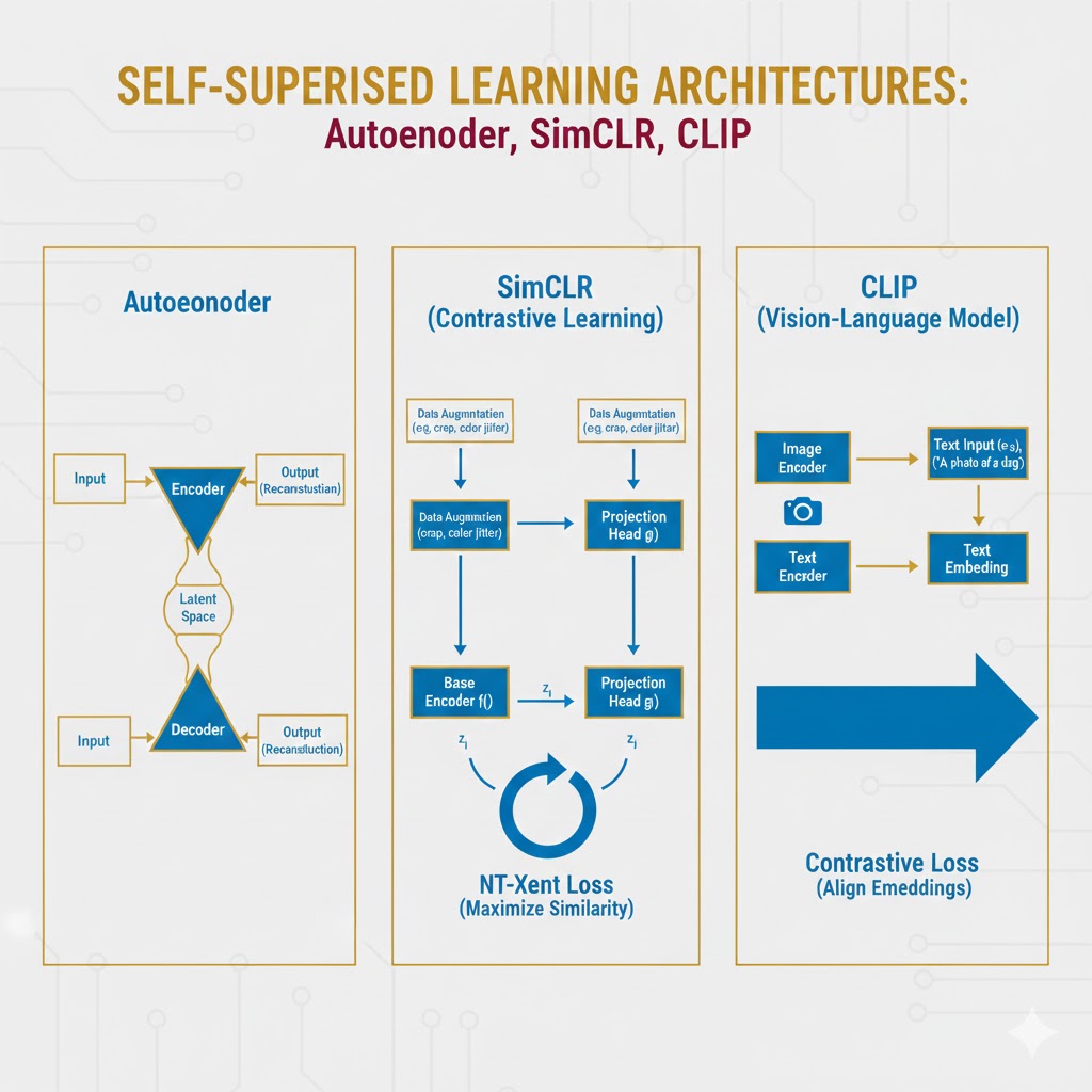 - یادگیری خود-نظارتی: این روش با تکنیکهای خلاقانه، نیاز به برچسب را دور میزند و سیگنالهای نظارتی را از ساختار خودِ داده استخراج میکند.