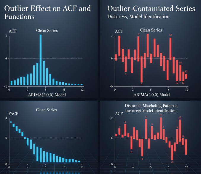 داده‌های پرت می‌توانند ACF و PACF نمونه‌ای را تحریف کنند و انتخاب مرتبه‌ی مناسب مدل (p, d, q) را گمراه سازند؛ در نتیجه ممکن است مدل اشتباه انتخاب شود.