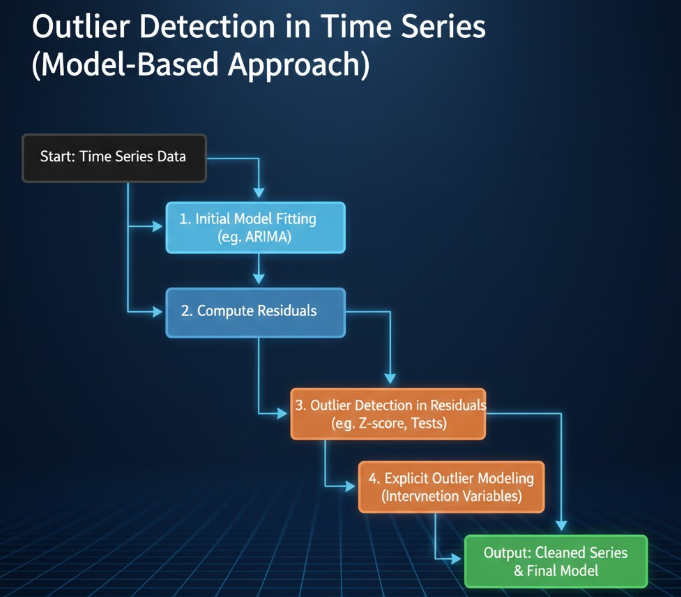 یک مدل سری زمانی )مثل ARIMA) روی داده‌ها برازش می‌دهیم، سپس پسماندها را بررسی می‌کنیم؛ پسماندهایی که از حد مشخصی فراتر می‌روند می‌توانند نشان‌دهنده‌ی داده‌ی پرت باشند.