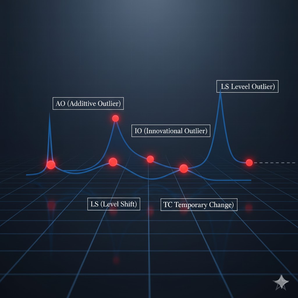 سری‌های زمانی ساختاری پویا و وابسته به زمان دارند، بنابراین Outlierها در آن‌ها تنها یک نقطه‌ی اشتباه نیستند؛ممکن است اثرشان به چندین مشاهده بعدی سرایت کند، یا بیانگر شکست ساختاری، رویداد ناگهانی یا تغییر رژیم تولید داده باشند.