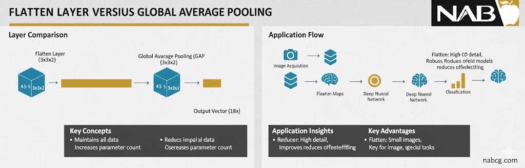 - Global Average Pooling (GAP): این لایه یک جایگزین هوشمند و مدرن برای لایه Flatten در شبکههای تصویری عمیق است. به جای اینکه تمام مقادیر را به یک بردار طولانی تبدیل کند، میانگین کل هر نقشه ویژگی را محاسبه میکند. این کار علاوه بر کاهش شدید بار محاسباتی، مقاومت مدل را در برابر بیشبرازش (Overfitting) به شدت بالا میبرد.