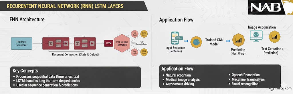تصور کنید میخواهید کلمهی بعدی یک جمله را پیشبینی کنید: من امروز به نانوایی رفتم تا … بخرم. یک لایه معمولی (Dense) فقط کلمات آخر را میبیند، اما لایه بازگشتی کلمهی نانوایی را که در ابتدای جمله آمده به خاطر میسپارد و به احتمال زیاد کلمهی نان را پیشنهاد میدهد.