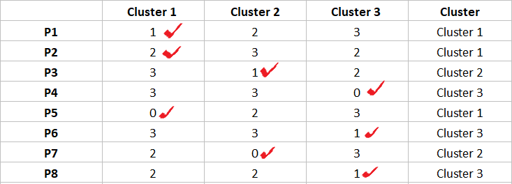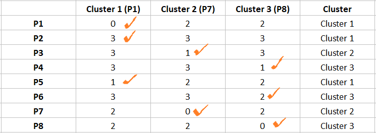 مشاهدات P1، P2، P5 به خوشه 1 اختصاص داده شده است. P3، P7 به خوشه 2 اختصاص داده می شوند. و P4، P6، P8 به خوشه 3 اختصاص داده شده اند.
