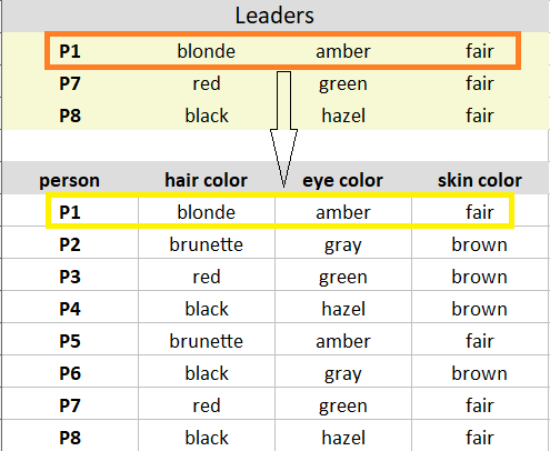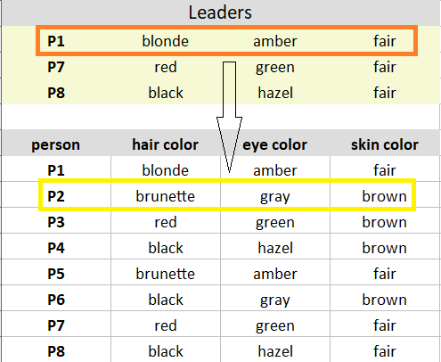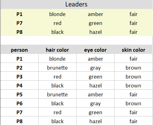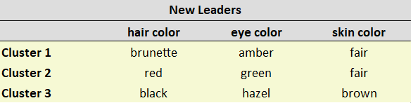 توضیح: مشاهدات خوشه 1 (P1, P2, P5) دارای رنگ موی سبزه به عنوان بیشترین مشاهده شده، کهربایی به عنوان بیشترین مشاهده رنگ چشم و روشن به عنوان بیشترین مشاهده رنگ پوست است.