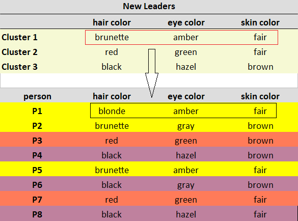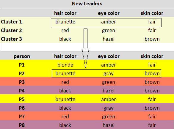 توجه: اگر همه خوشه ها با یک مشاهده تفاوت مشابهی دارند، به هر خوشه به طور تصادفی اختصاص دهید. در مورد ما، مشاهده P2 دارای 3 تفاوت با همه رهبران است. من به طور تصادفی آن را به خوشه 1 اختصاص دادم.