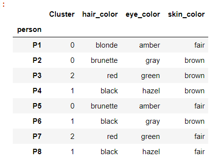 توجه: اگر مقادیر مشابهی را مشاهده کردید، حالت را به طور تصادفی انتخاب کنید. در مورد ما، مشاهدات خوشه 3 (P3، P7) دارای یک رنگ پوست قهوه ای و روشن است. من به طور تصادفی رنگ قهوه ای را به عنوان حالت انتخاب کردم.