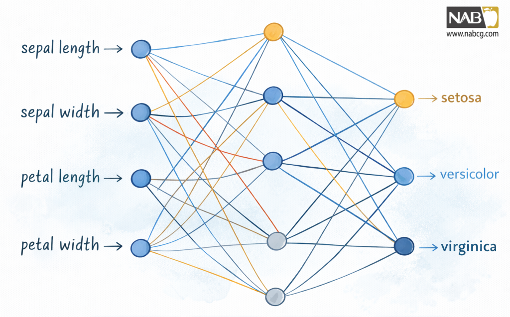 سمت چپ، چهار ورودی شبکه قرار دارند که متناظر با چهار ستون اول جدول داده هستند. سمت راست، سه خروجی ممکن قرار دارند که هر کدام نشاندهنده یکی از برچسبهای گونههای زنبق است. در این میان، لایه پنهان قرار دارد، که پیچیدگی را به معماری شبکه اضافه میکند، که برای مدیریت دادههای غیرخطی قابل تفکیک ضروری است. هر گره در لایه پنهان به هر گرهای که قبل و بعد از آن میآید، متصل است. این معمولاً یک لایه کاملاً متصل (fully connected) یا متراکم (dense) نامیده میشود.