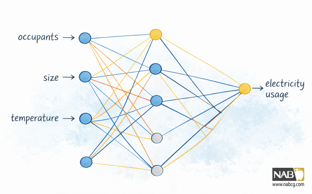 شبکه عصبی برای این مسئله باید سه گره ورودی داشته باشد که متناظر با سه ستون اول (ساکنان، اندازه، دما) هستند. در عین حال، باید یک گره خروجی داشته باشد که ستون چهارم، یعنی حدس شبکه در مورد مصرف برق، را نمایش میدهد. به صورت دلخواه میگوییم لایه پنهان شبکه باید چهار گره داشته باشد، نه پنج گره. شکل این معماری شبکه را نشان میدهد.