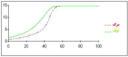 با توجه به این ساختار، شکل زیر نتایج سری زمانی حاصل از شبیه سازی این مدل را از زمان=0 تا زمان=100 نشان میدهد. در شکل، رفتار نمایی نرخ زاد و ولد را از زمان=0 تا حدود زمان=40 میبینیم. در زمان = 40، تأثیر افزایش تراکم جمعیت بر میانگین طول عمر با “افزایش” نرخ مرگ و میر در گله شروع میشود. پس از این مرحله، با افزایش تراکم جمعیت، فاصله بین نرخ تولد و مرگ به تدریج کاهش مییابد. در زمان 58 ، نرخ تولد و مرگ برابر میشود و سیستم به تعادل میرسد.