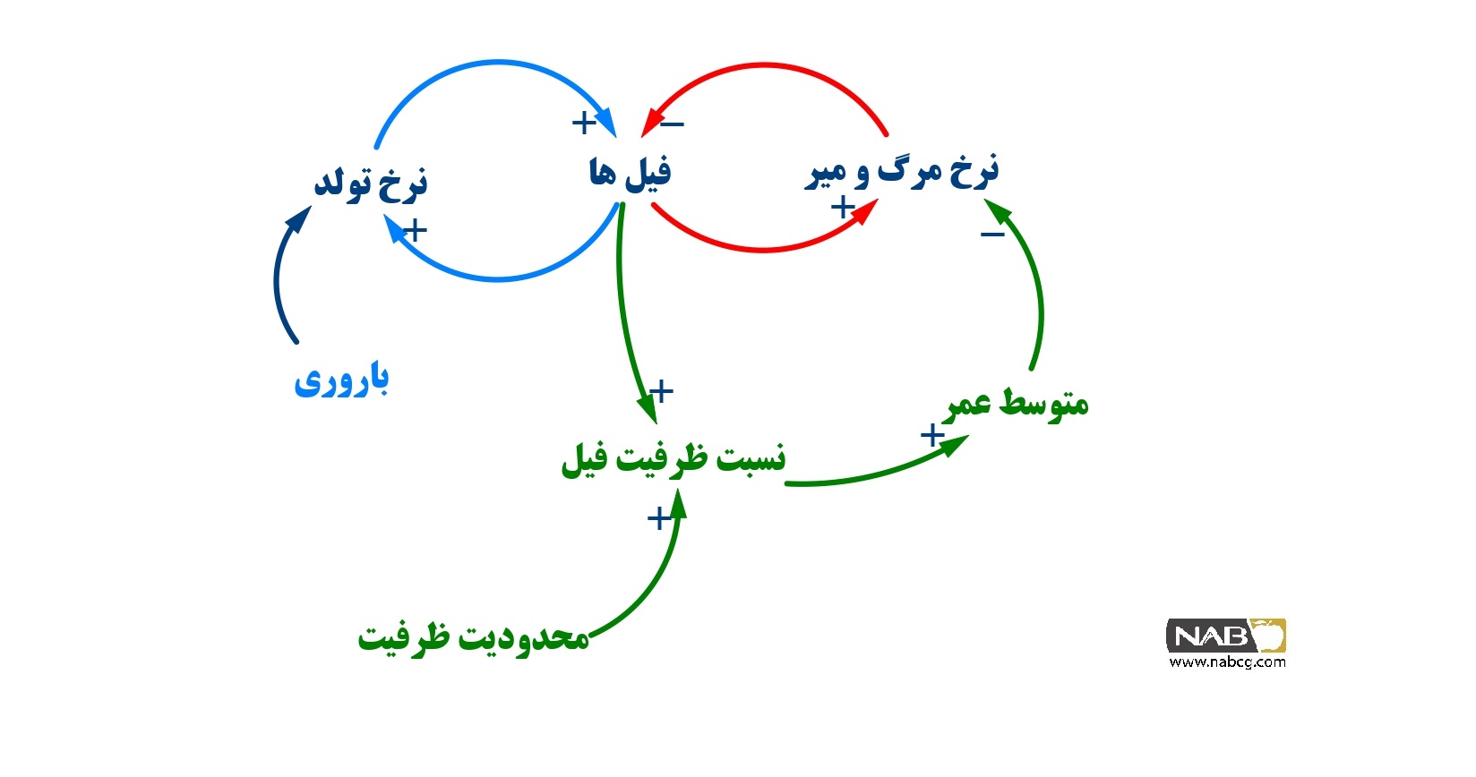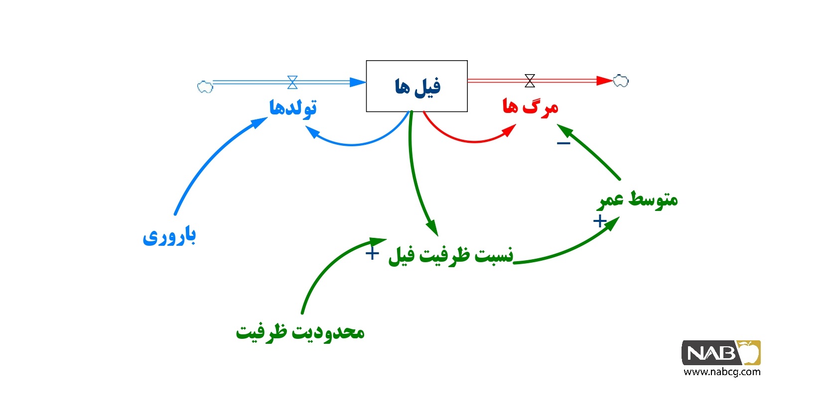 حلقه مثبت نرخ تولد، که به رنگ آبی نشان داده شده است، مسئول رشد نمایی تجربه شده در مراحل اولیه رشد گله است. با افزایش جمعیت گله، نرخ تولد – با توجه به مقدار ثابت باروری (باروری) – افزایش مییابد. افزایش نرخ زاد و ولد باعث رشد بیشتر گله میشود. در تعادل، حلقه نرخ مرگ و میر منفی که با رنگ قرمز نشان داده شده است، مسئول کاهش جمعیت گله است. به خودی خود، میزان مرگ و میر فیلها به طور ضمنی جمعیت را به صفر میرساند. با مرگ فیلها، جمعیت کاهش مییابد تا زمانی که جمعیت تعادلی صفر به دست میآید که در آن دیگر فیل نمیمیرد. حلقه ظرفیت تحمل منفی که به رنگ سبز نشان داده شده است، تأثیر افزایش تراکم جمعیت را بر میانگین طول عمر – و در نتیجه میزان مرگ و میر – گله فیل در نظر میگیرد