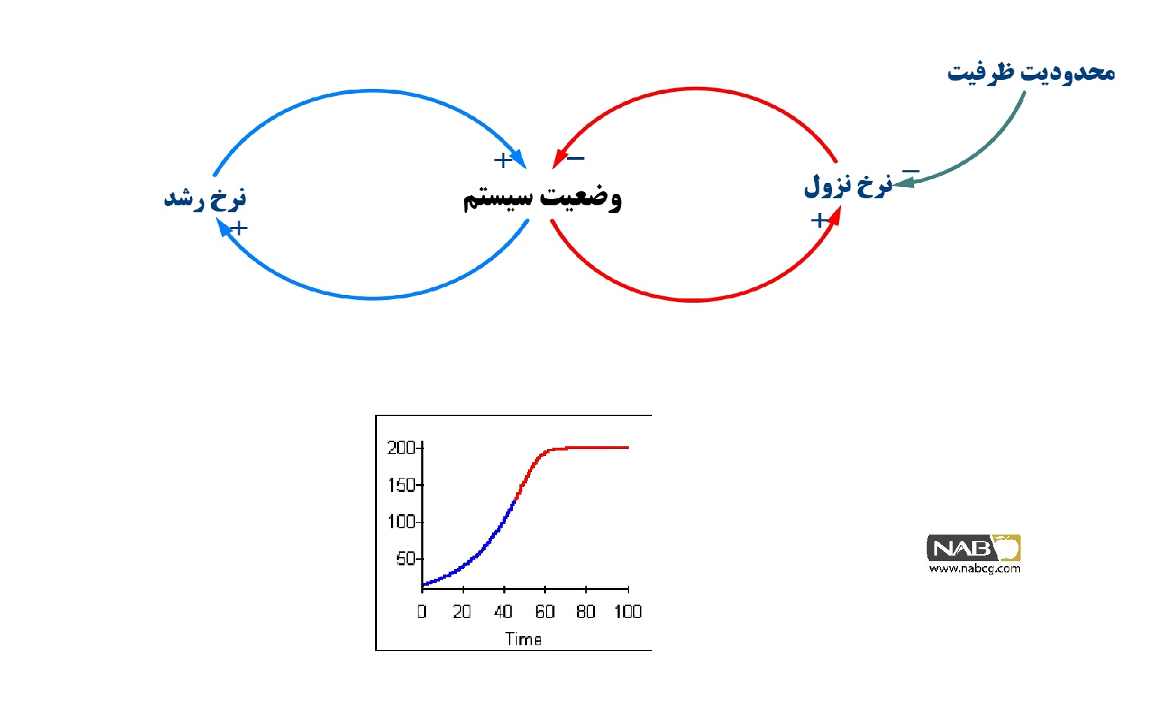در ابتدا وقتی متغیر حالت سیستم نسبت به اصل منبع کوچک است، محدودیتهای رشد غیرفعالند و حلقههای مثبت غالب اند. وقتی یک واحد اضافی به متغیر حالت سیستم افزوده شود، بیشتر به نرخ خالص رشد کمک میکند تا به شکل نمایی رشد کند. به هر حال، نتیجه مستقیم آن رشد، کاهش کفایت منبع است. با فعال شدن محدودیتهای رشد، حلقههای منفی با قدرت بیشتری رشد میکنند تا وقتی که کم کم بر پویایی سیستم حکم فرما شوند.