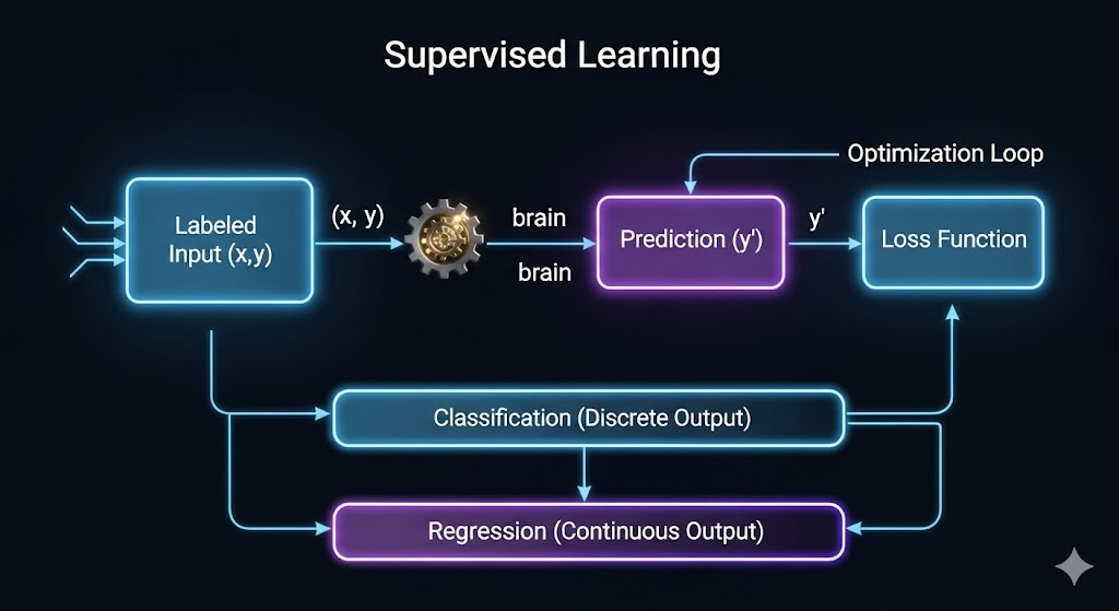- ورودی برچسبدار: مجموعه داده شامل نمونههایی است که هر نمونه (x) دارای یک خروجی یا برچسب صحیح (y) است مانند: (عکس سیب، “سیب”)، (تراکنش مشکوک، “تقلب”).