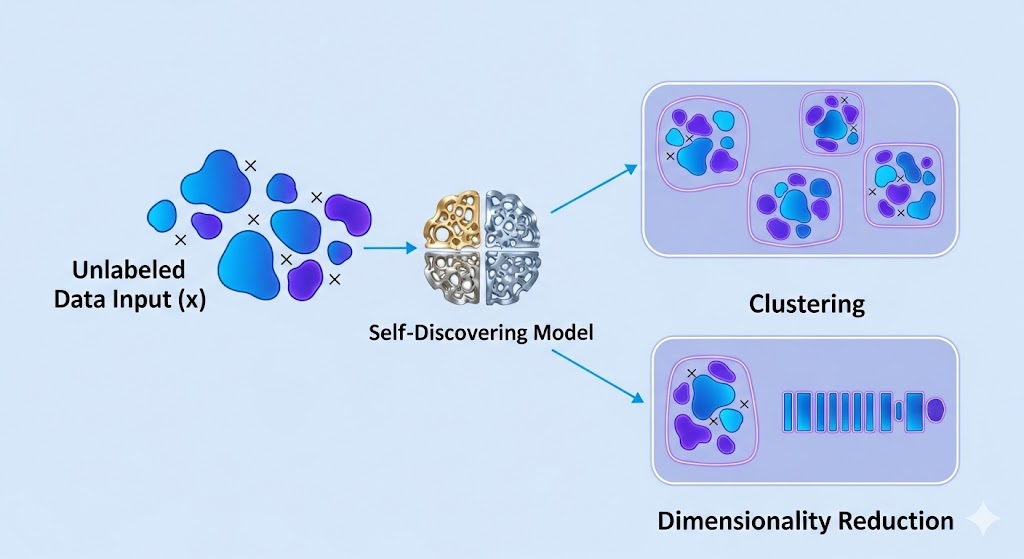 یادگیری بدون نظارت، پارادایم مخالف است. در این رویکرد، مدل با دادههای بدون برچسب (Unlabeled Data) آموزش میبیند و وظیفه دارد به صورت مستقل، ساختارها، روابط و الگوهای ذاتی دادهها را کشف کند.