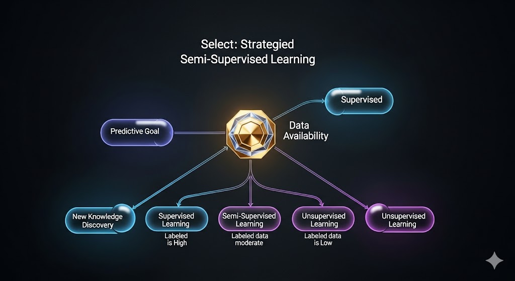 - آیا دادههای برچسبدار کافی در دسترس هستند؟ اگر دادههای با کیفیت برچسبدار وجود نداشته باشند یا هزینه برچسبگذاری بالا باشد، یادگیری بدون نظارت برای کاوش اولیه یا نیمهنظارتشده برای ساخت مدل نهایی، بهترین انتخاب است.