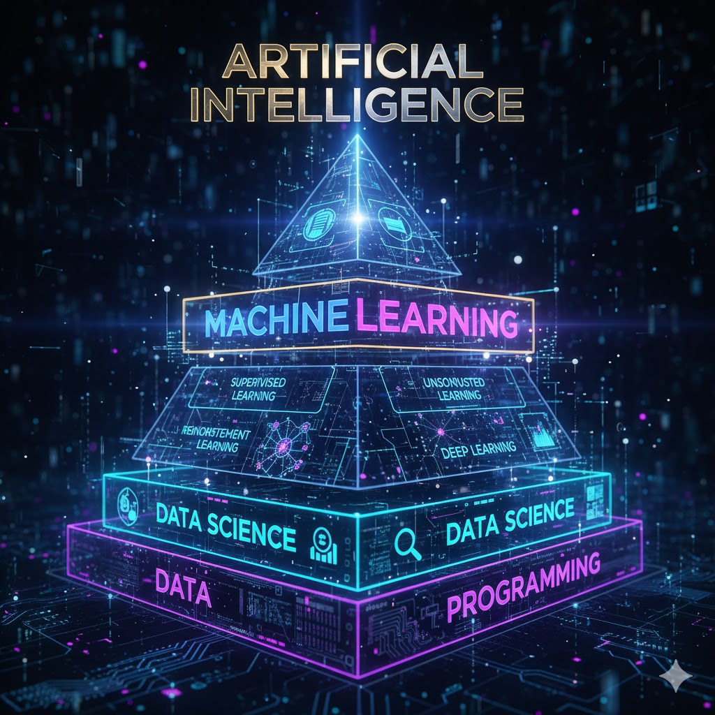 برای درک بهتر، بیایید یادگیری ماشین را در چارچوب گسترده‌تر هوش مصنوعی قرار دهیم: